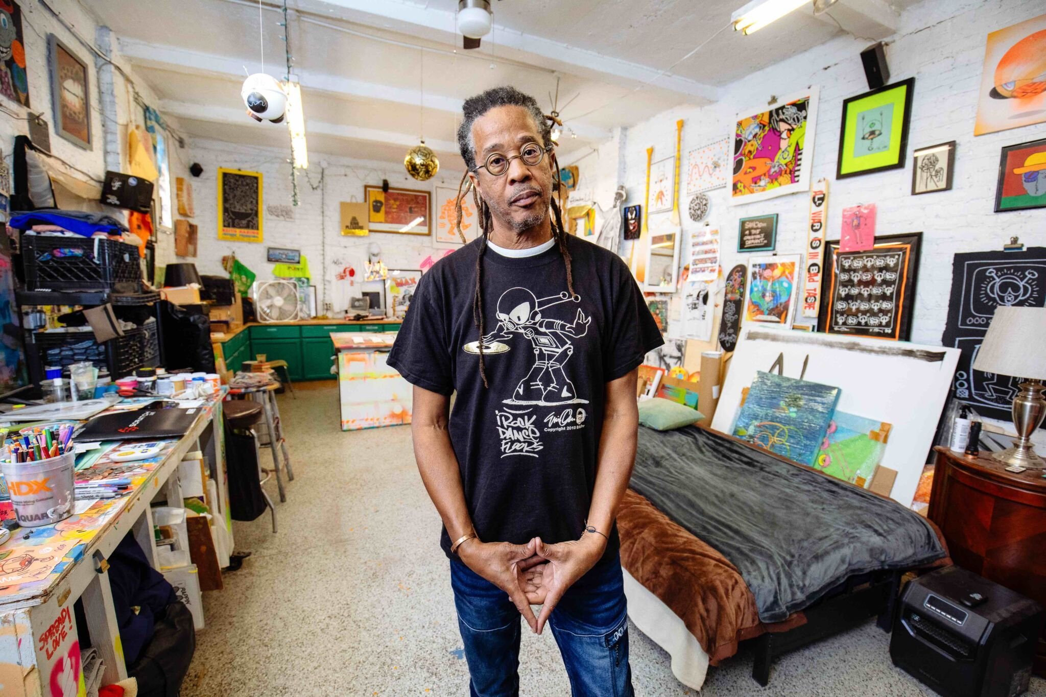 Keith se me acercó y me preguntó si me gustaría colaborar con él en algunos dibujos, ya que reconoció mi robot, que yo llevaba serigrafiado en mi camiseta, a partir de los dibujos que estaba haciendo en el metro, en los mismos espacios donde él trabajaba.